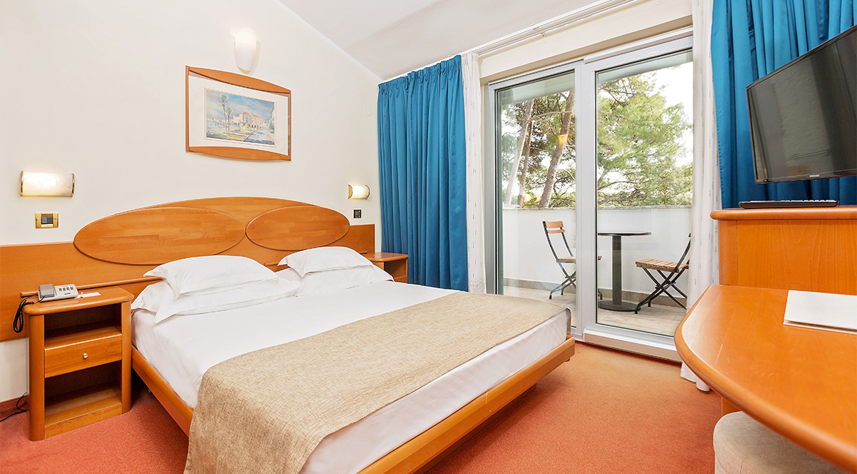 Soba je velika okoli 14 m2, ima francosko posteljo, balkon in kopalnico z banjo. Idealna zmogljivost sobe je maks. 2 odrasli osebi.